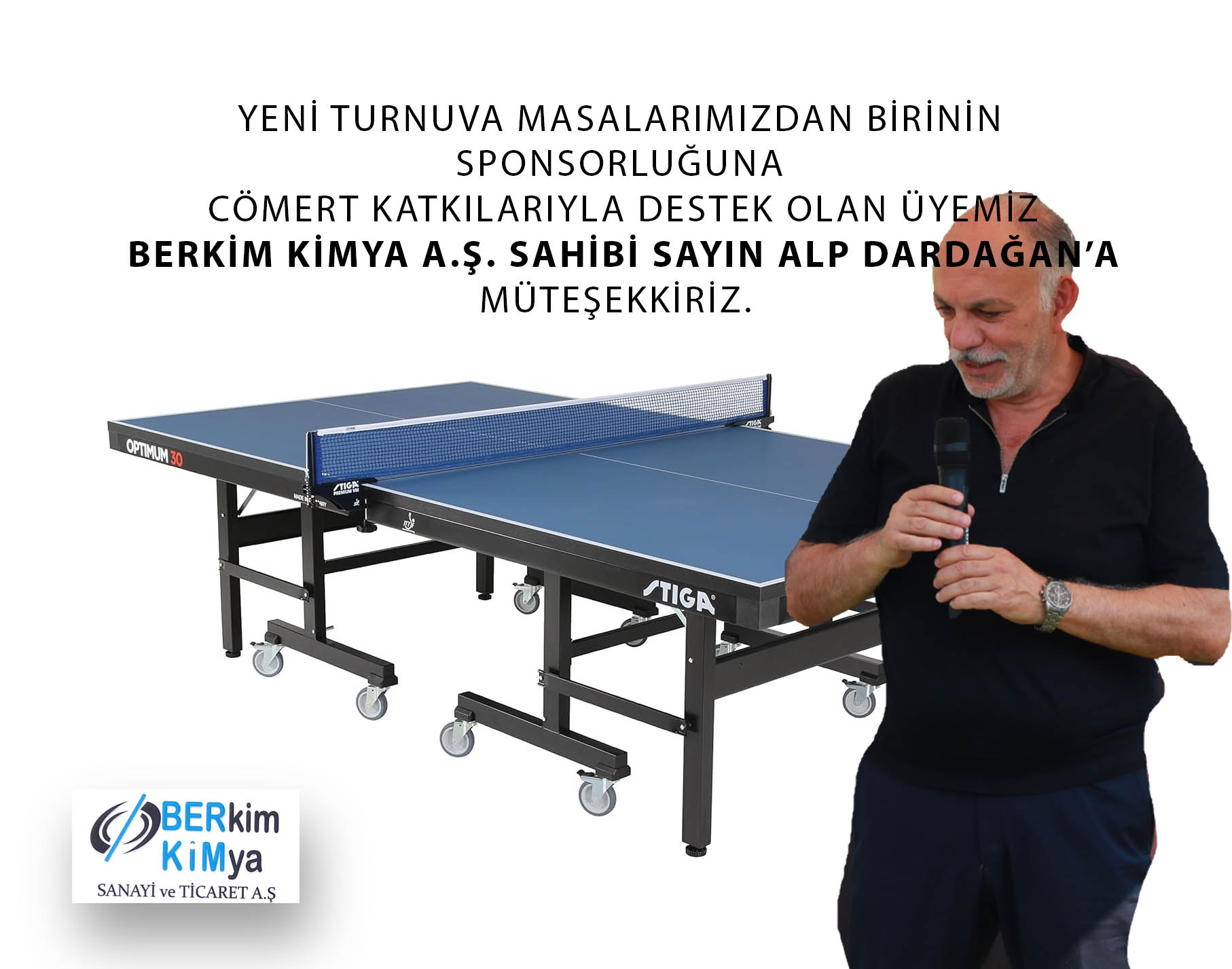 Bursa Veteran Masa Tenisçileri Spor Kulübü olarak masalarımızı yenileme kapsamında almakta olduğumuz Stiga Optimum masalardan birine Üyemiz, Berkim Kimya A.Ş. sahibi Sayın Alp Dardağan cömert bağışıyla katkıda bulunmuştur.